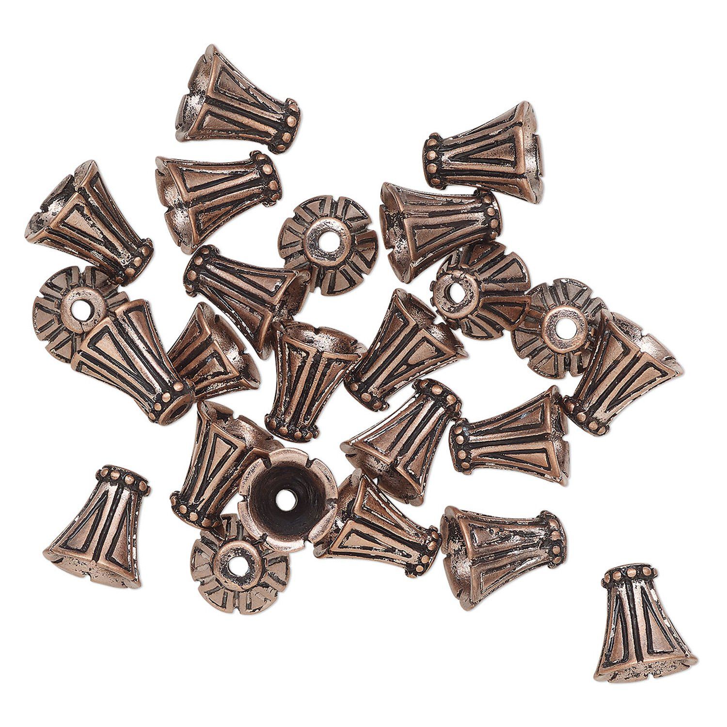Cone, antique copper-finished "pewter" (zinc-based alloy), 12x11mm cone with triangle design, 7.5mm inside diameter. Sold per pkg of 24.