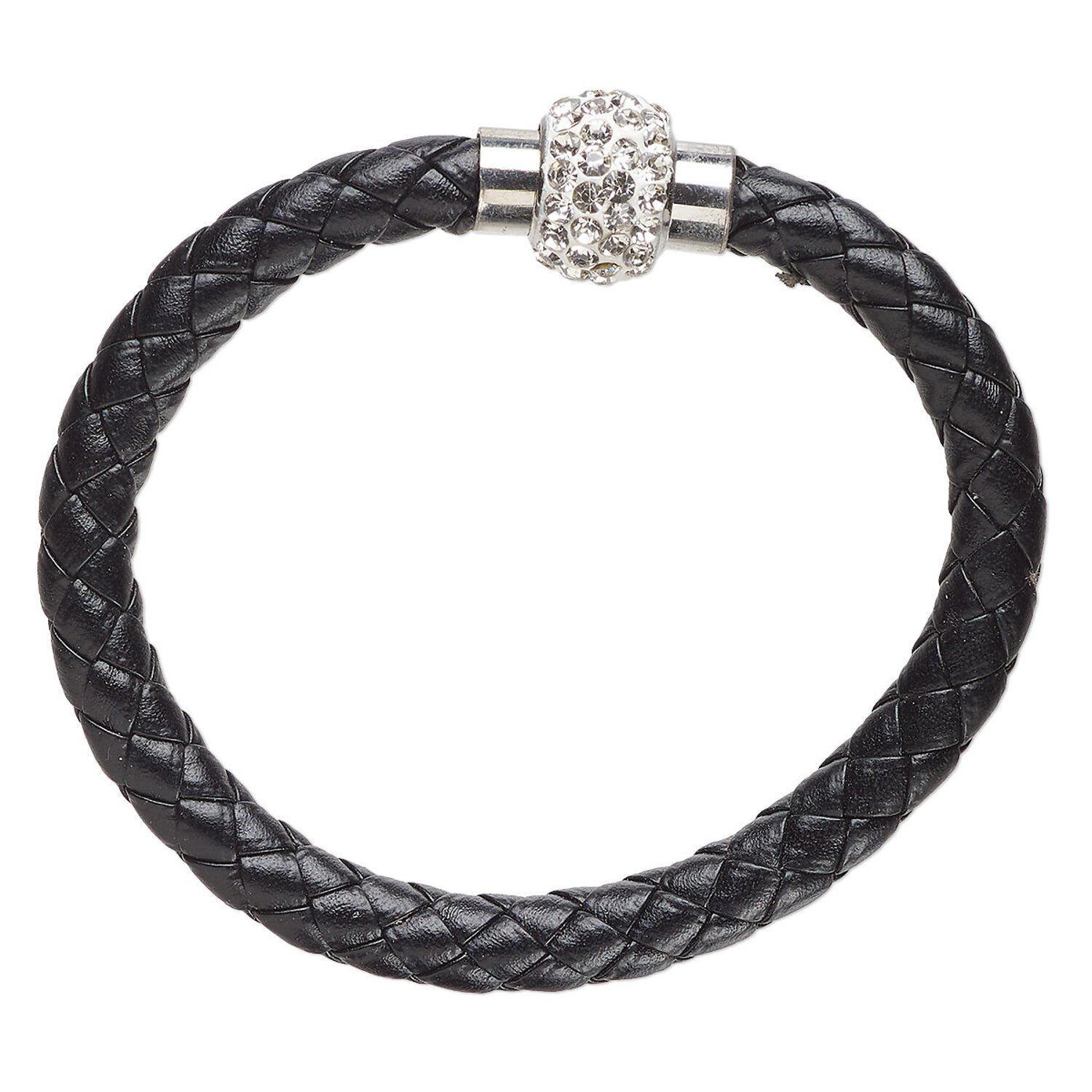 Bracelet, leather (dyed) / silver-finished brass / glass, black / white / clear, 6mm bolo cord, 7 inches with magnetic clasp. Sold individually.