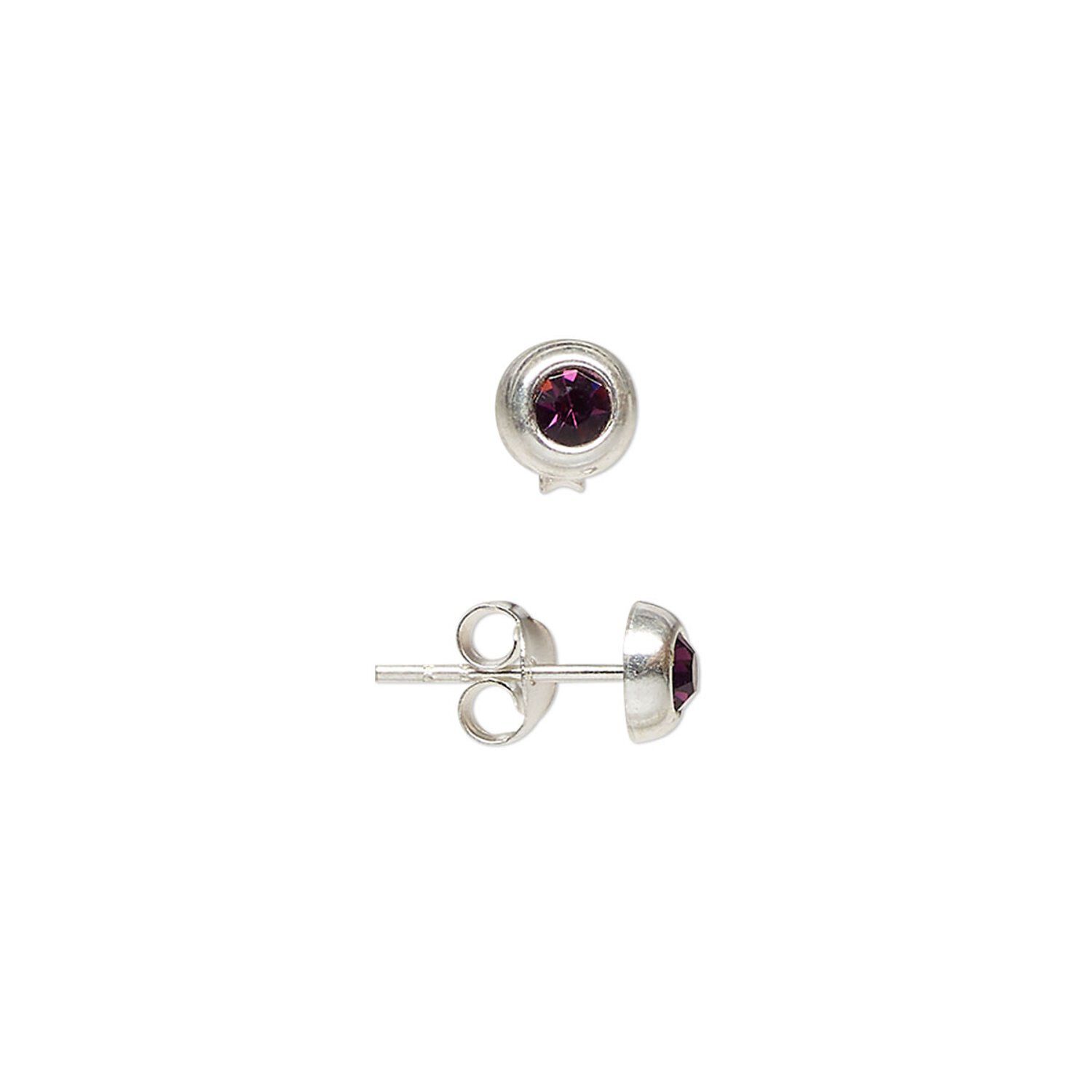 Earring 1pkg2 sterling silver, 6mm flower earstud / earnuts, glass amethyst purple 1 pair