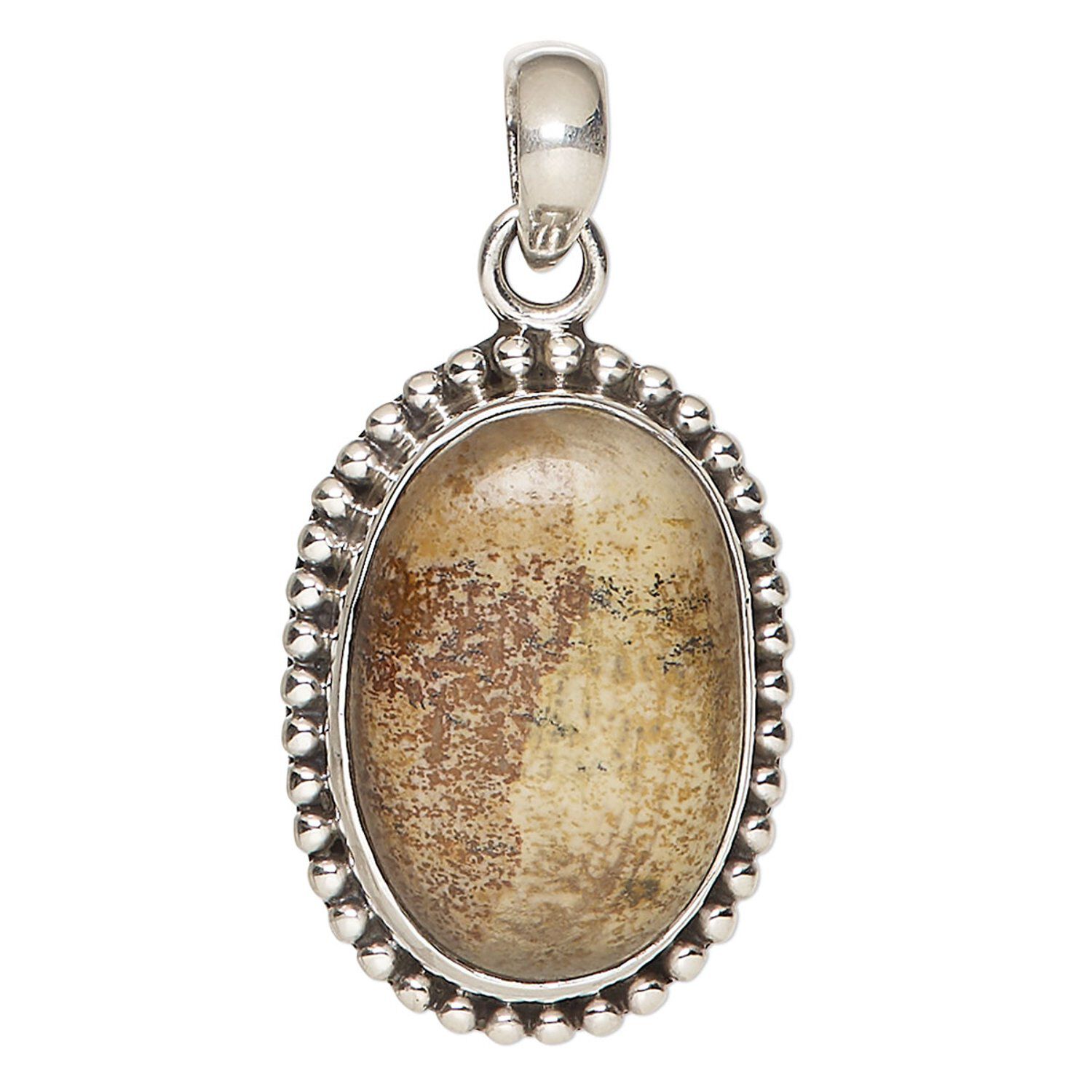 Pendant, picture jasper (natural) and sterling silver, 30x25mm beaded oval. Sold individually.
