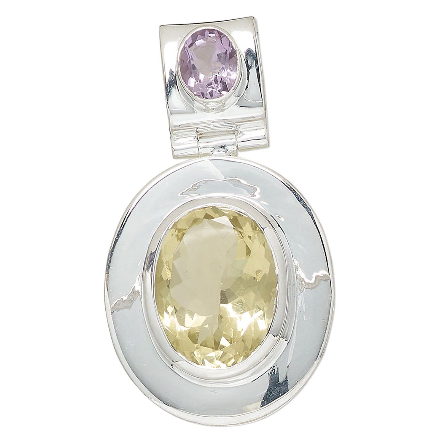 Pendant, lemon quartz (natural/heated)/amethyst (natural/heated)/sterling silver, 50x28mm oval. Sold individually.