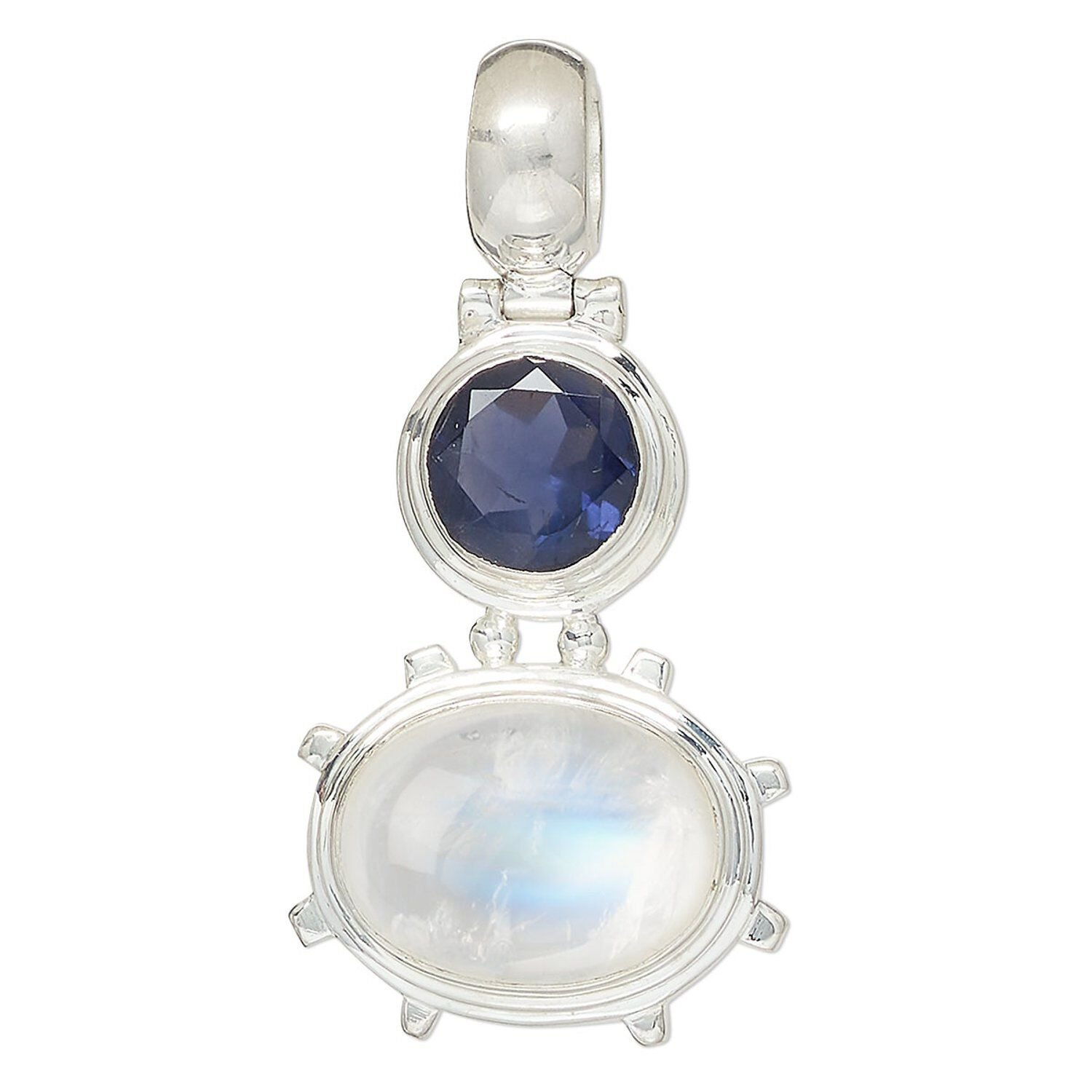 Pendant, rainbow moonstone (natural) / iolite (natural) / sterling silver, 40x26mm oval. Sold individually.