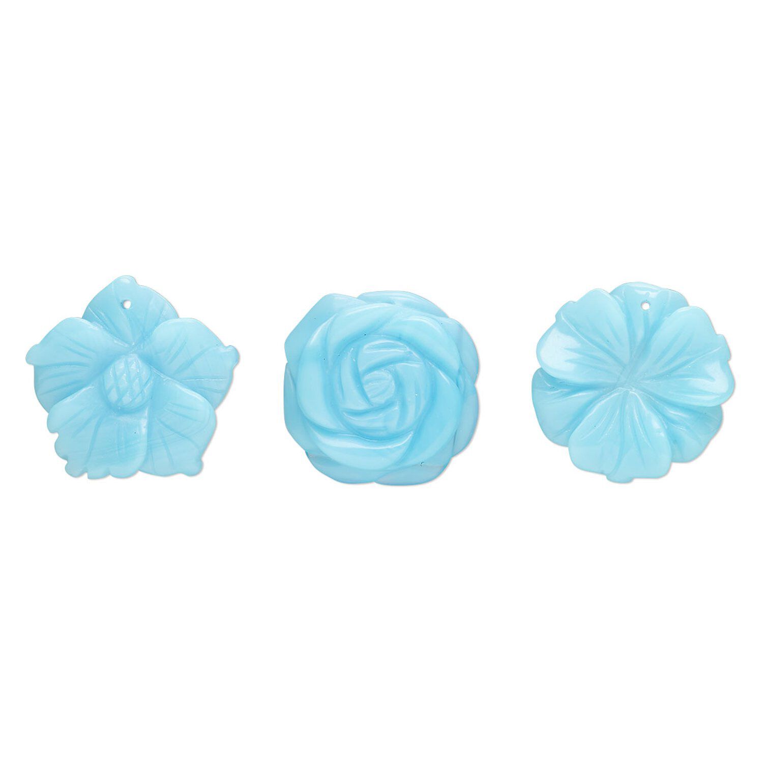 Focal mix, glass, translucent light blue, 34x31mm-34x34mm top-drilled carved flower. Sold per pkg of 3.