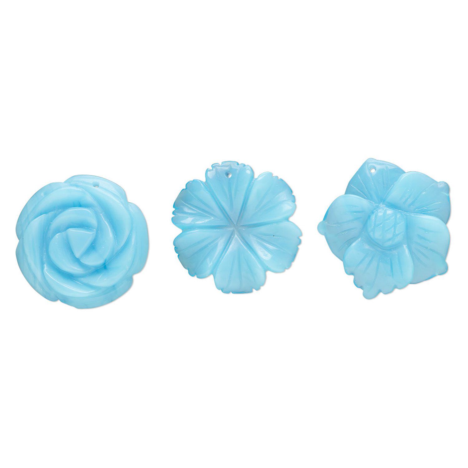 Focal mix, glass, translucent light blue, 40x35mm-40x40mm top-drilled carved flower. Sold per pkg of 3.