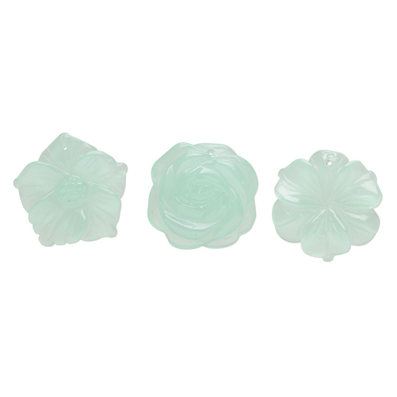 Focal mix, glass, translucent mint green, 35x30mm-35x34mm top-drilled carved flower. Sold per pkg of 3.