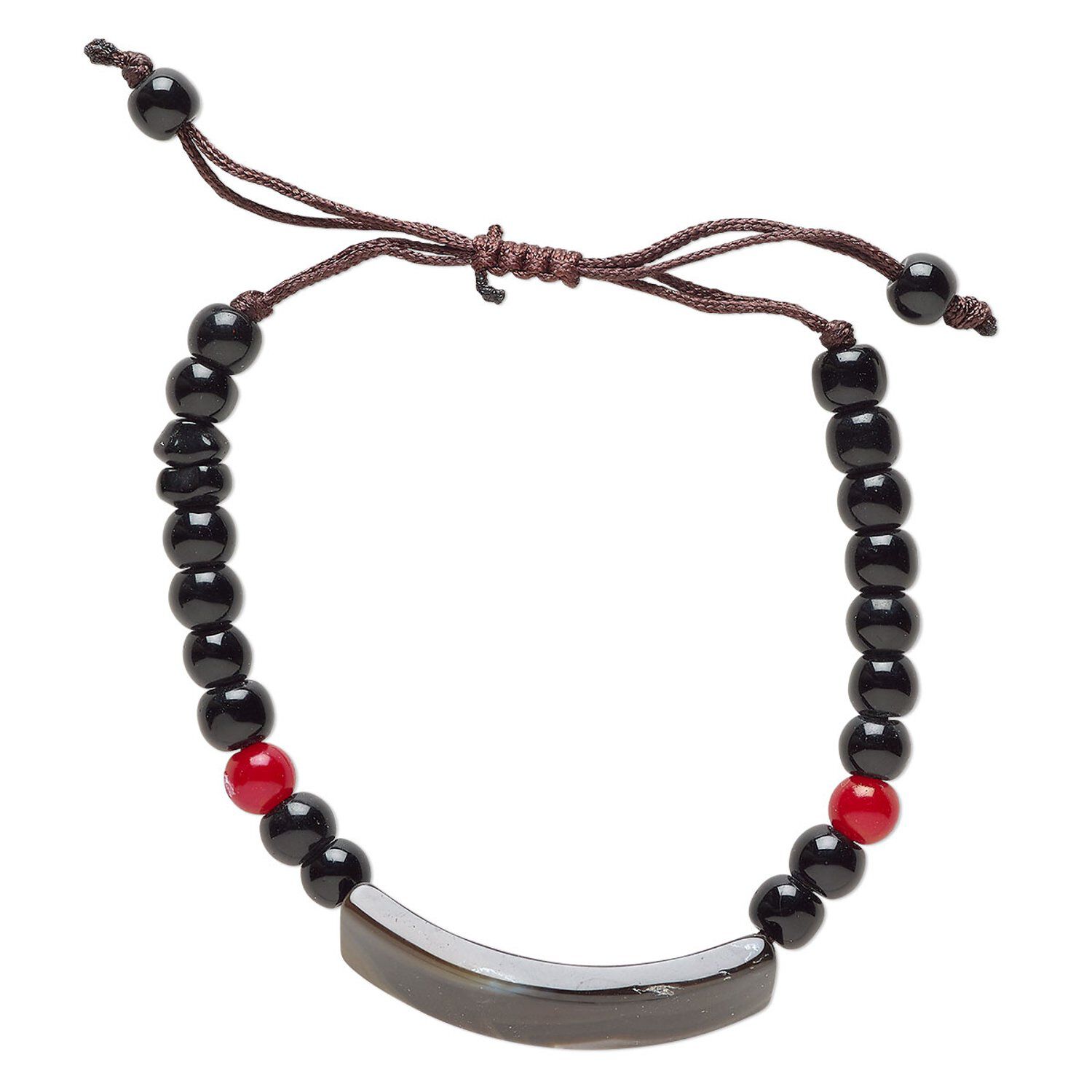 Black agate / glass / waxed cotton 1pkg1, curved rectangle bracelet adjustable 5-7.5 inch 10mm
