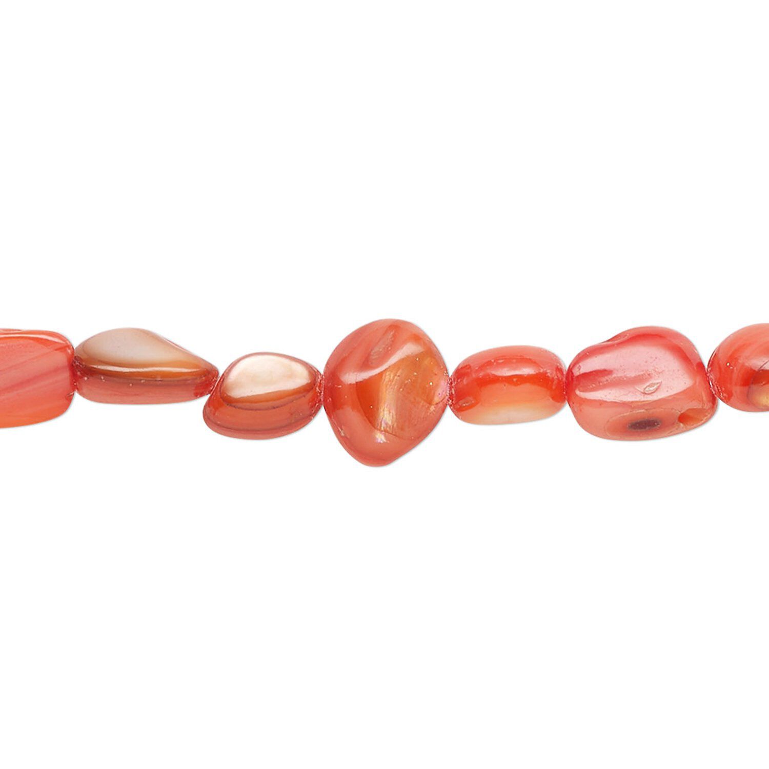 Bead, mother-of-pearl shell (dyed), red-orange, small to large pebble, Mohs hardness 3-1/2. Sold per 30-inch strand.