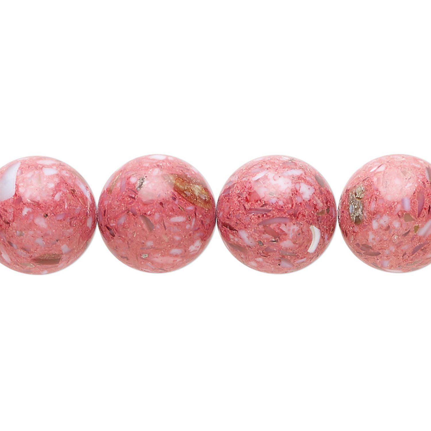 These unique beads are made with mother-of-pearl shell chips and other gemstones such as amethyst, calcite, serpentine and more, bound together with colored resin for strength and durability.
