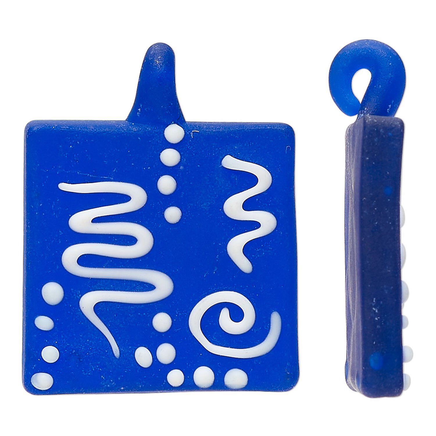 Focal, lampworked glass, frosted translucent cobalt blue and opaque white, 27-28mm flat square with line and dot design. Sold individually.