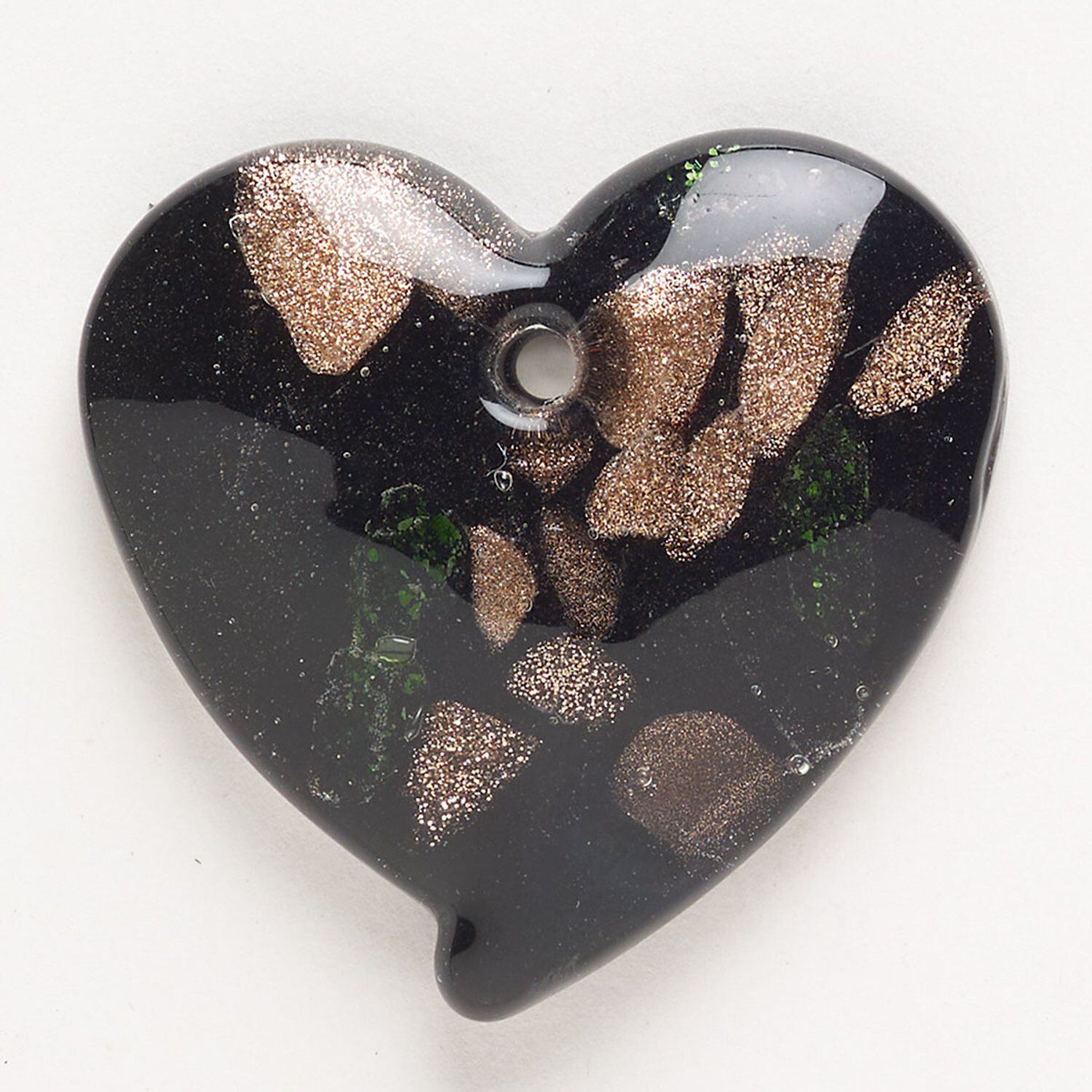 Focal, lampworked glass, pkg/1, opaque black and green, 37x35-38x36mm top-drilled puffed heart with flat back.