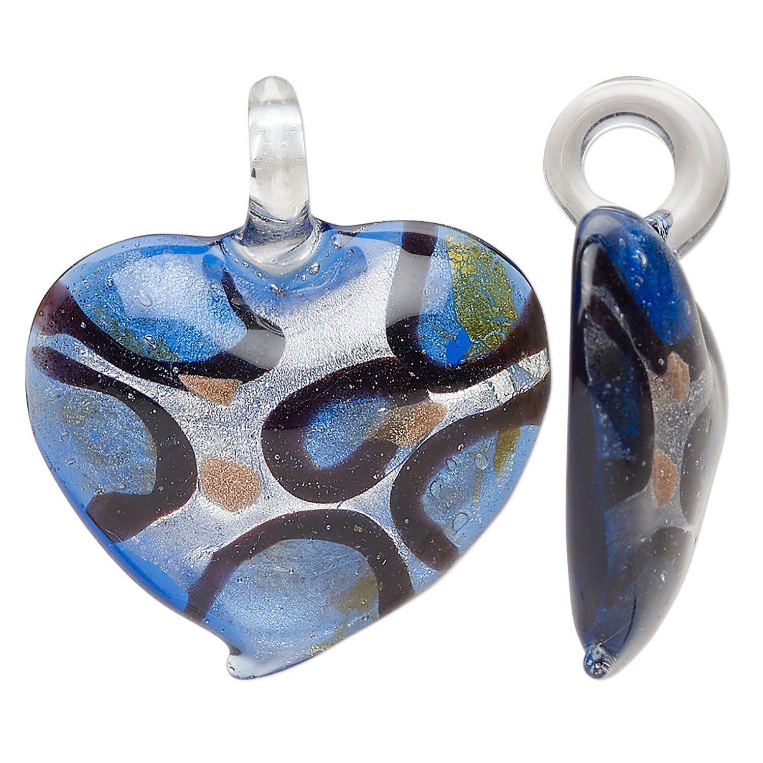Focal, lampworked glass, multicolored, 32x31mm-35x33mm domed heart with copper-colored glitter and silver-colored foil. Sold individually.
