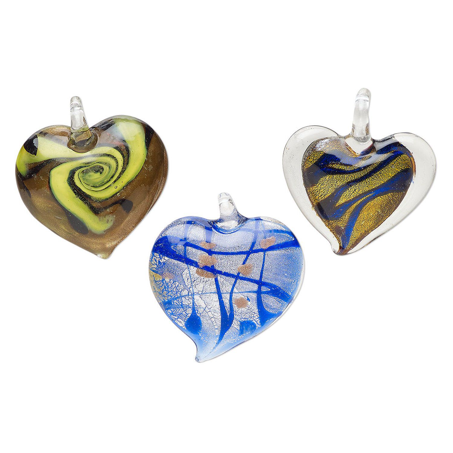 Random focal mix, lampworked glass, translucent blue and multicolored, 40x37mm-49x47mm domed heart with copper-colored glitter and silver-colored foil. Sold per pkg of 3.