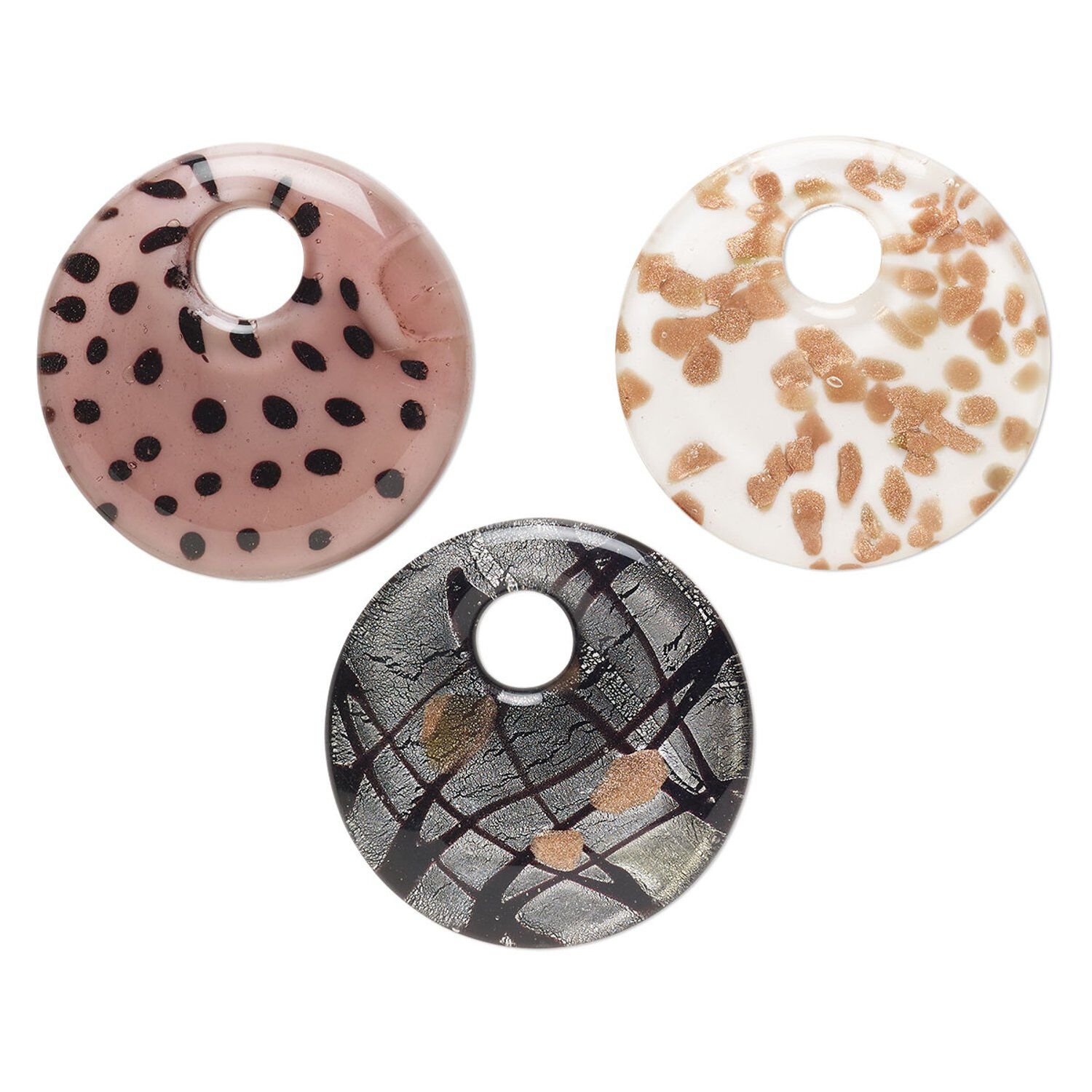 Random focal mix, lampworked glass, pkg/3, opaque and translucent mixed colors with silver-colored foil and copper-colored glitter, 49-51mm undrilled go-go.