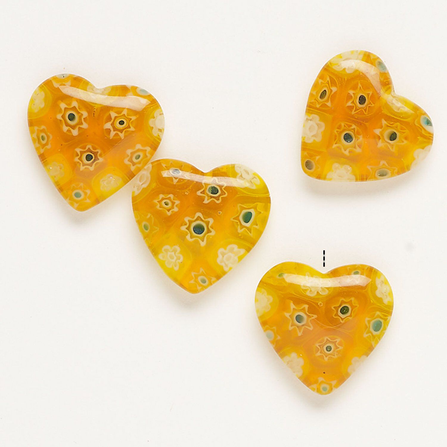 Millefiori—Italian for "a thousand flowers"—is created by fusing multiple glass rods arranged so that the cross-section creates a flower or pattern with a mosaic-like appearance. Add up-eye to use. Colors can include yellow, clear, white and red.