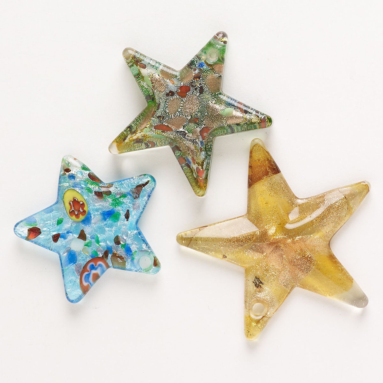 Pressed mix, glass, pkg/3, translucent mixed colors with silver-colored foil and copper-colored glitter, 37x35mm-50x46mm flat-sided and puffed star.