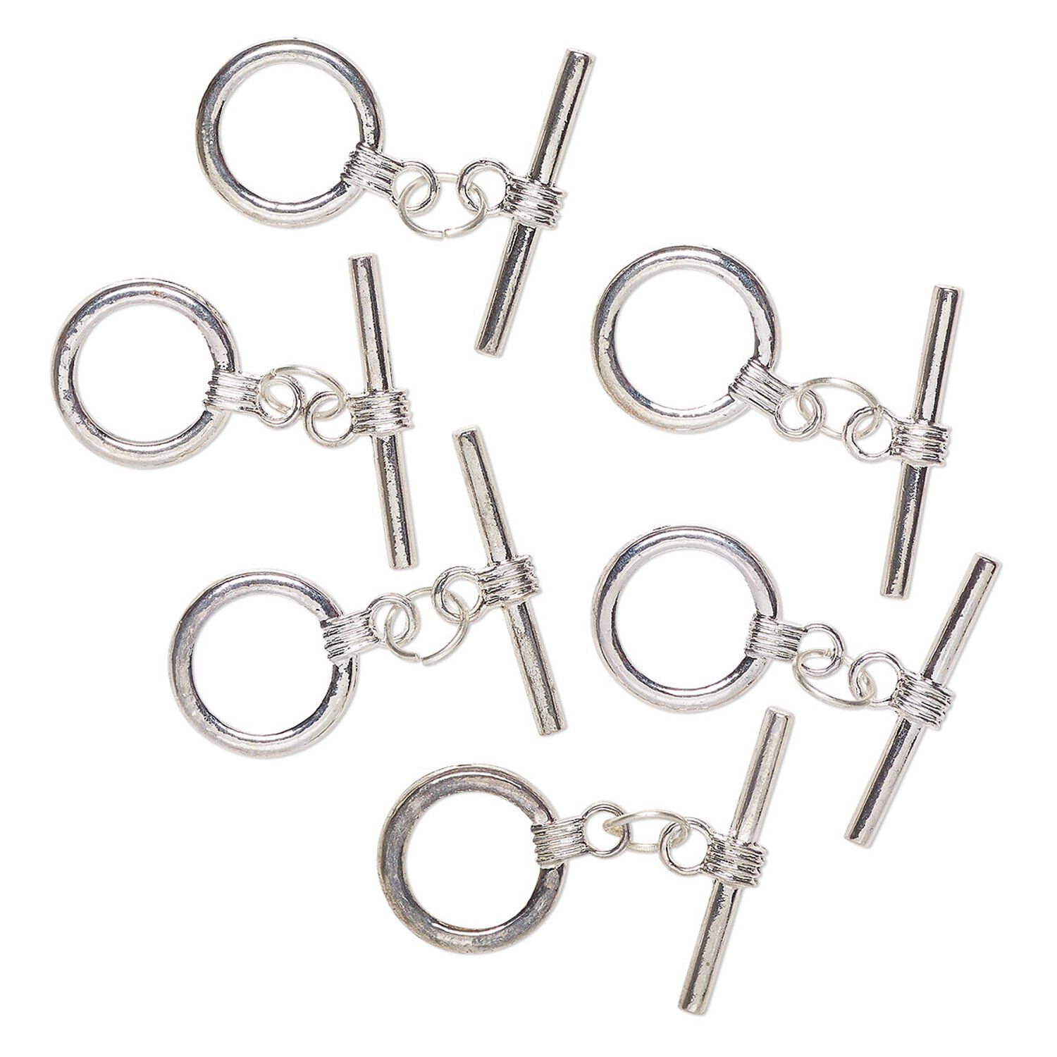Clasp, toggle, "pewter" (zinc-based alloy), pkg/6, 15mm round, silver finish.