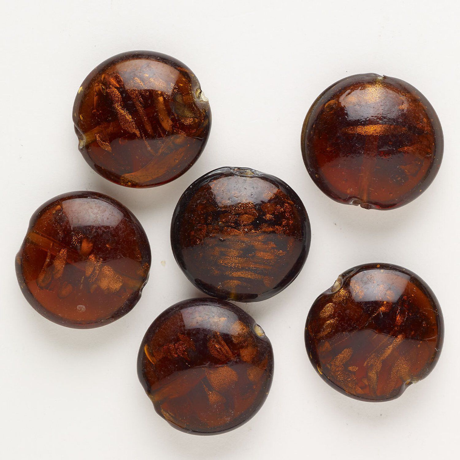 Bead, lampworked glass, opaque brown with copper-colored glitter, 25-28mm puffed flat round with swirl design. Sold per pkg of 6.