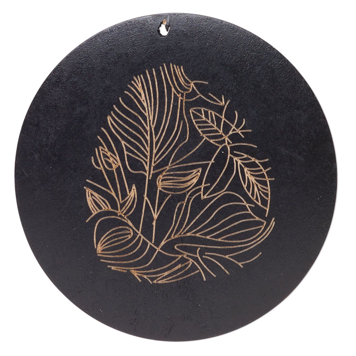 Focal, wood (natural / dyed), black and tan, 58-60mm top-drilled carved round with leaf. Sold individually.