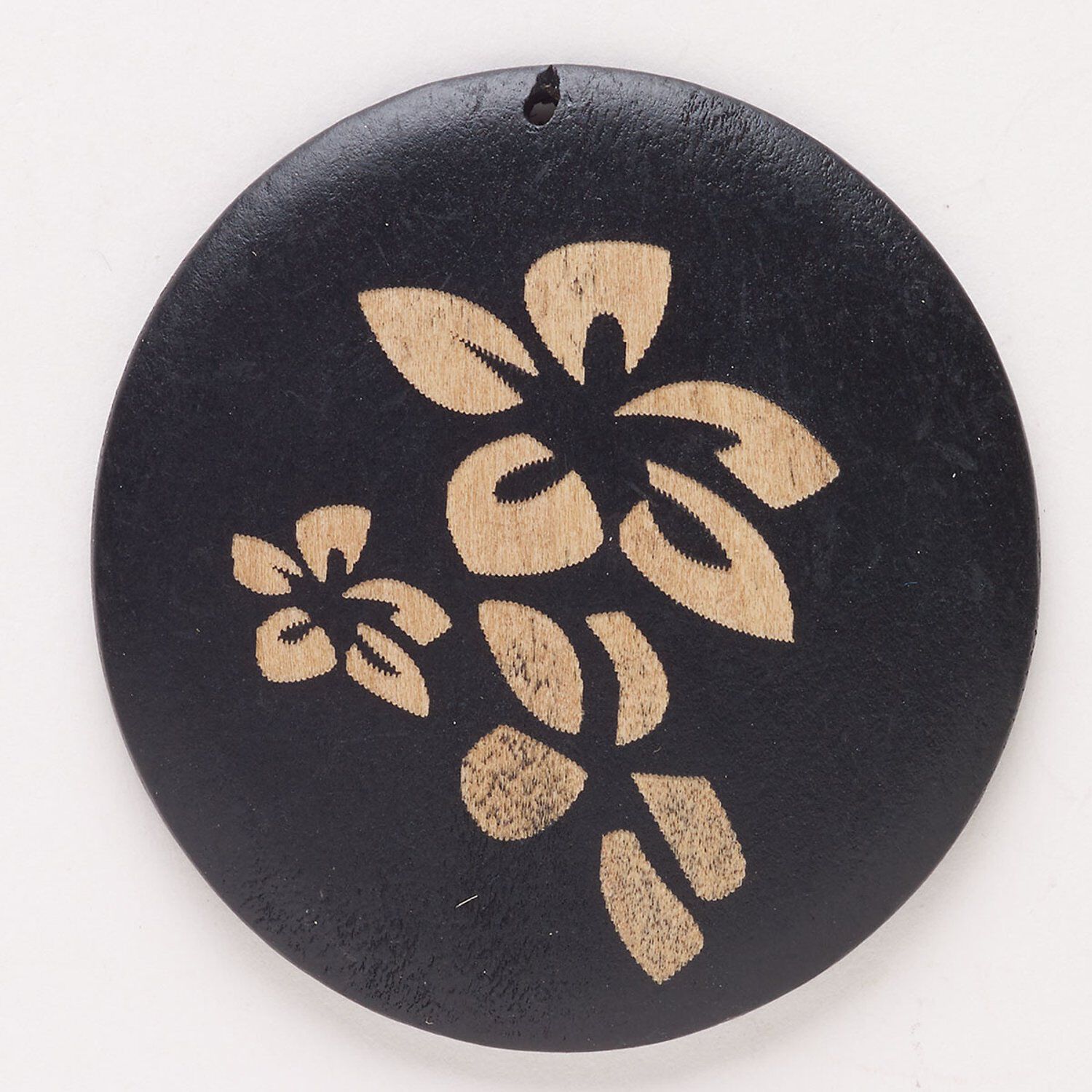 Focal, wood (natural / dyed), black and tan, 58-60mm top-drilled carved round with flower. Sold individually.