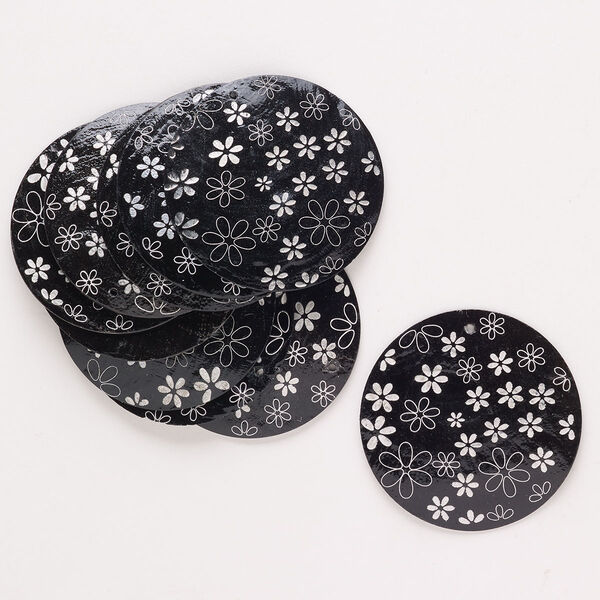 Focal, Capiz shell (dyed), black and white, 49-51mm round with flower, Mohs hardness 3-1/2. Sold per pkg of 10.
