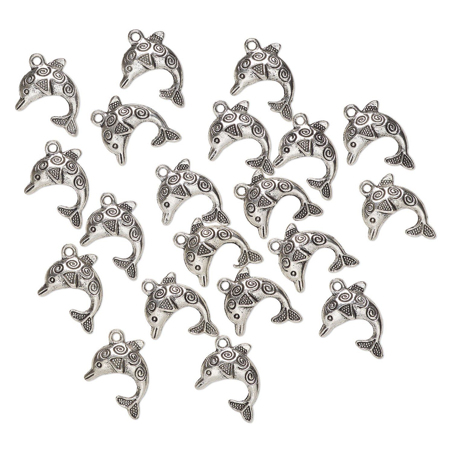 Charm, "pewter" (zinc-based alloy), pkg/20, 27x22mm single-sided dolphin with swirl, antique silver finish.