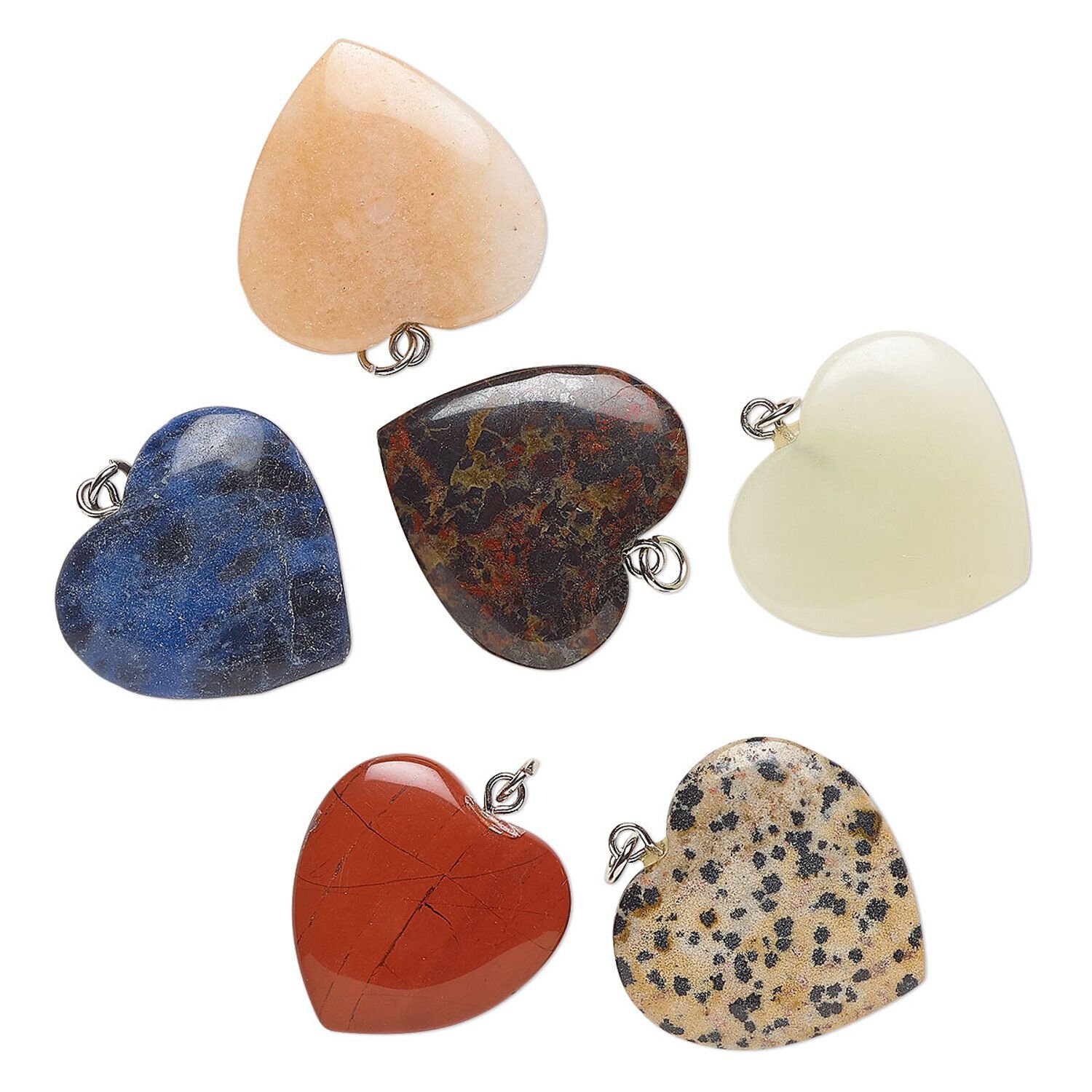 Drop mix, silver-finished steel and multi-gemstone (natural / dyed / manmade), 24-28mm puffed heart. Sold per pkg of 6.