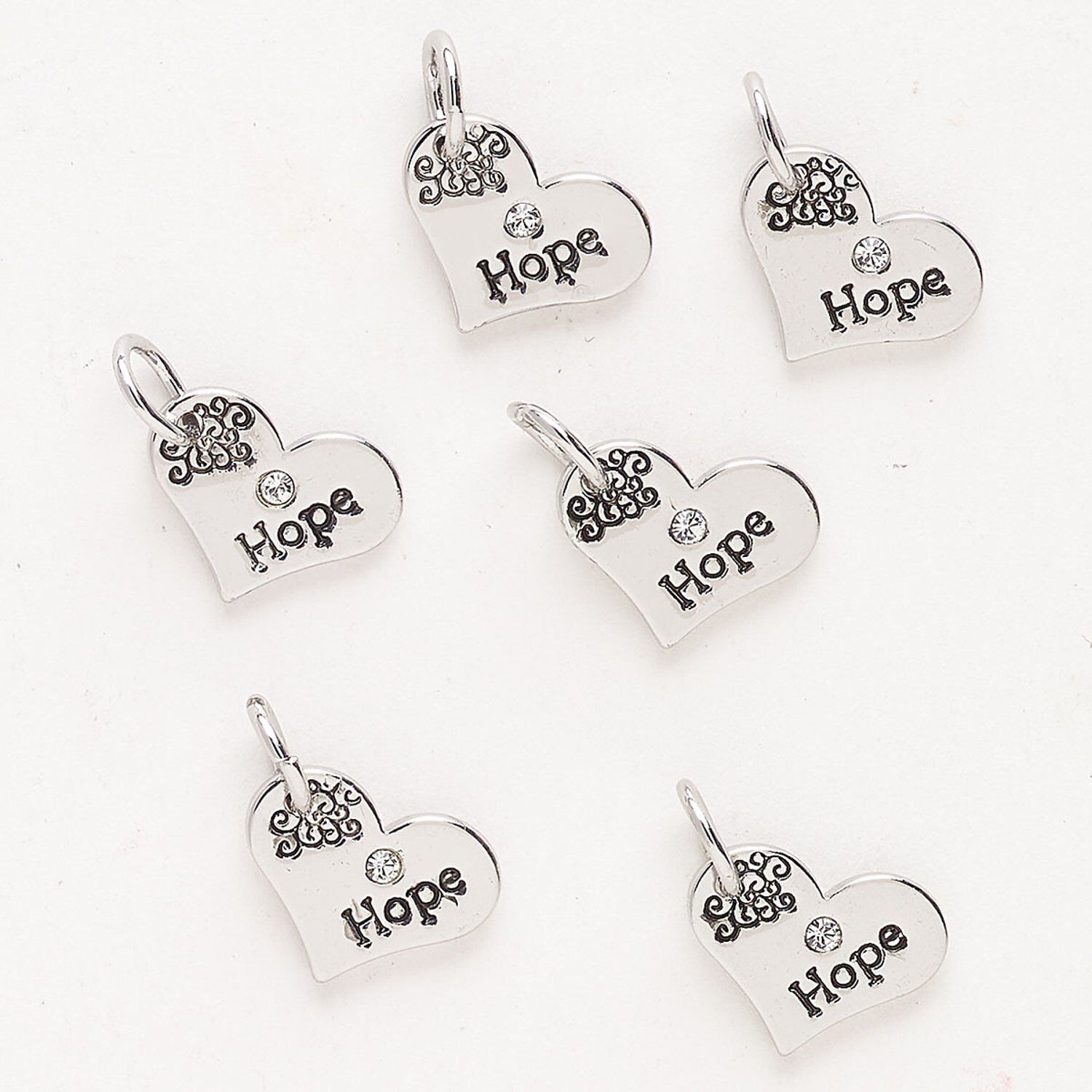 Drop "pewter" zinc-based alloy glass 6pk 12x9mm affirmation heart "Hope," antique silver finish clear