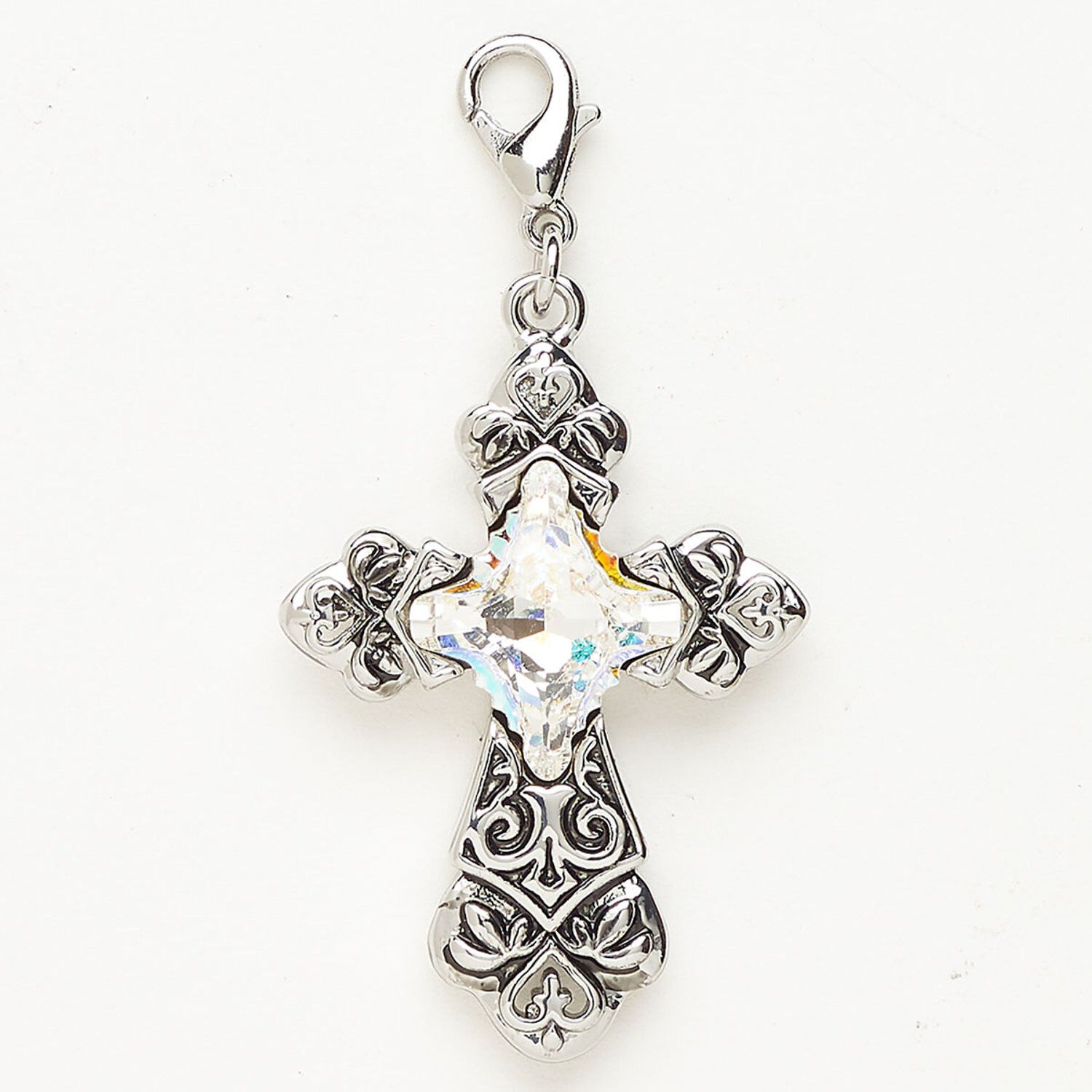 Focal "pewter" (zinc-based alloy) / crystal 1pkg1 31x24mm cross, clear AB / antique silver finish lobster claw clasp