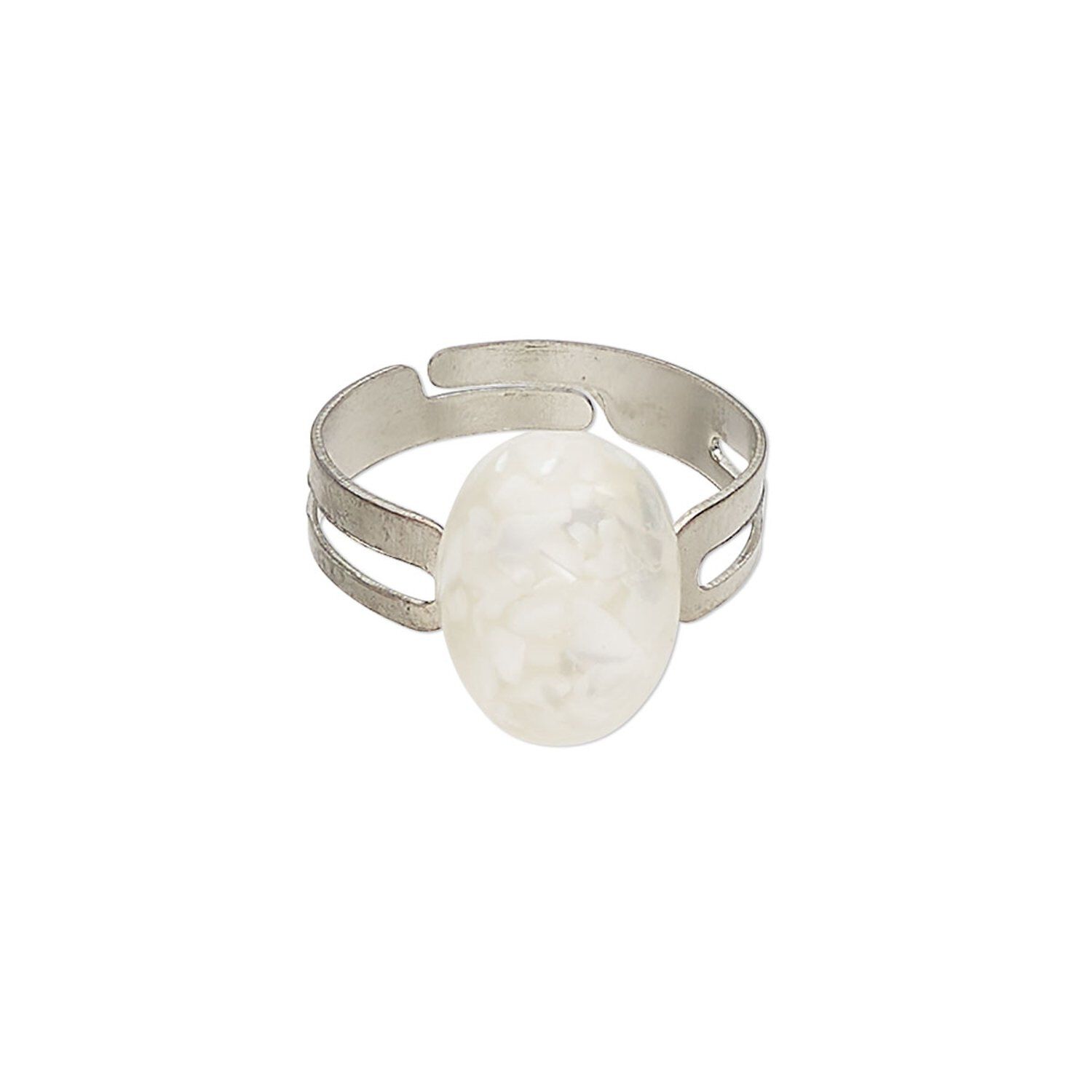 Ring 1pkg1 steel / mother-of-pearl shell, 13x10mm oval, bleached/assembled silver finish / white
