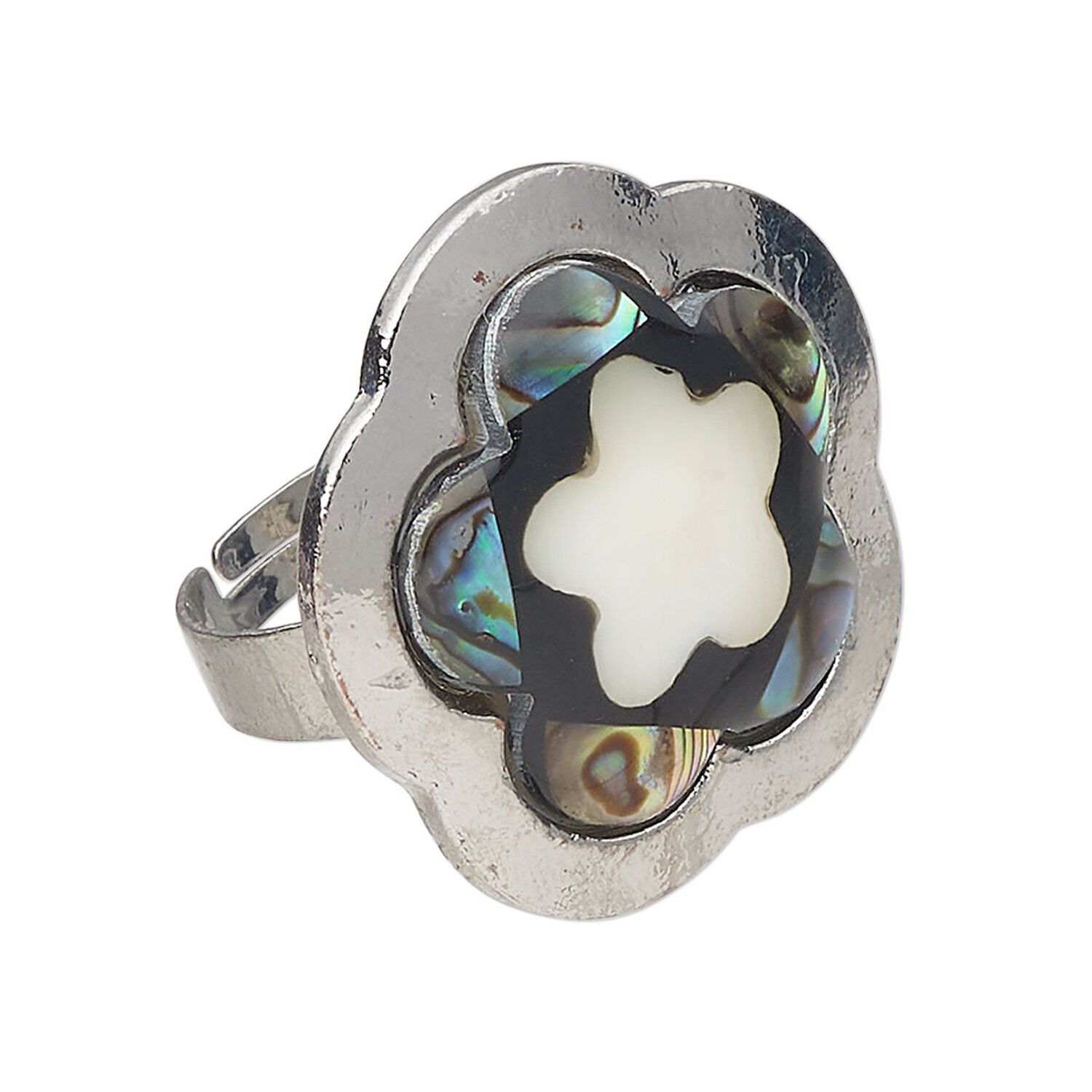 Ring 1pkg1 steel / mother-of-pearl shell / paua shell, 30mm flower, natural/bleached/dyed/assembled silver finish / white