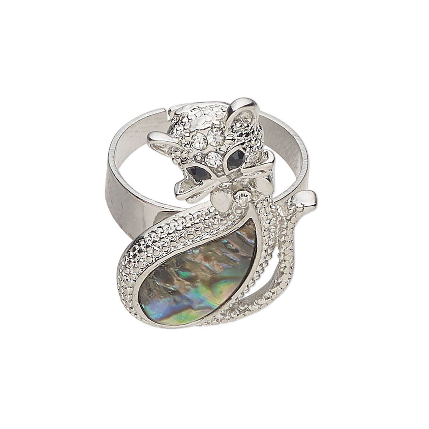 Ring 1pkg1 brass / paua shell / glass rhinestone, 32x21mm cat, natural silver finish / black / clear