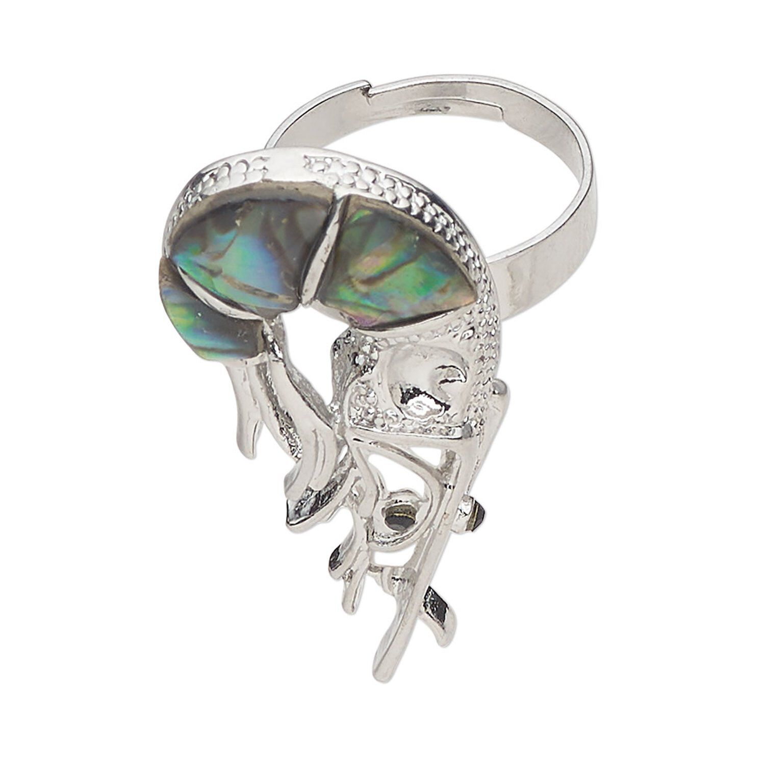 Ring 1pkg1 brass / paua shell / glass rhinestone, 38x19mm shrimp, natural silver finish/ black