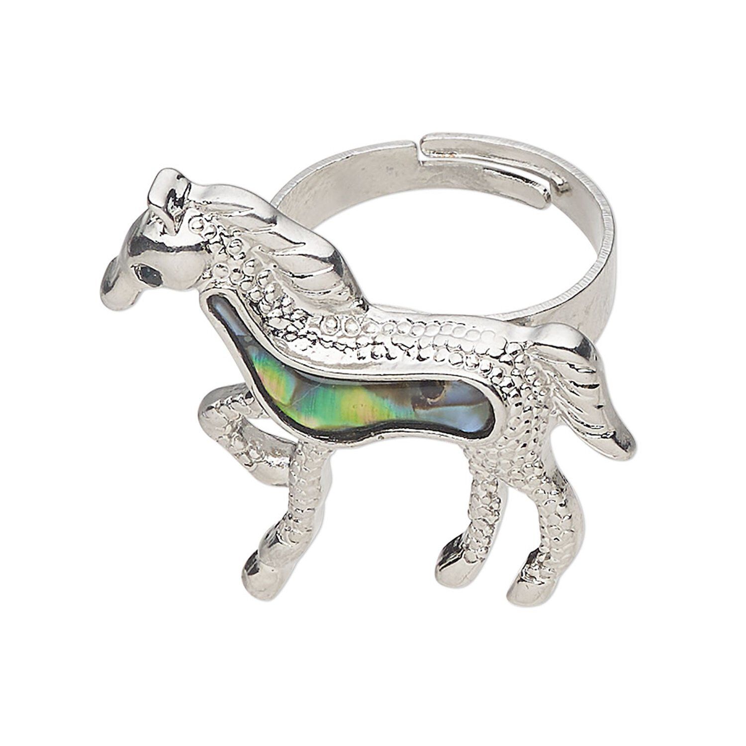 Ring 1pkg1 brass / paua shell / glass rhinestone, 32x31mm horse, natural silver finish / black
