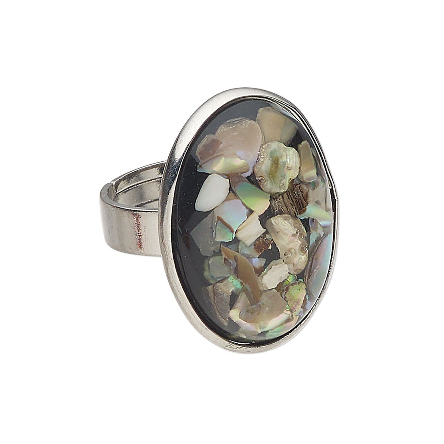 Ring 1pkg1 brass / multi-shell, 26x19mm oval, bleached/assembled silver finish / multicolored