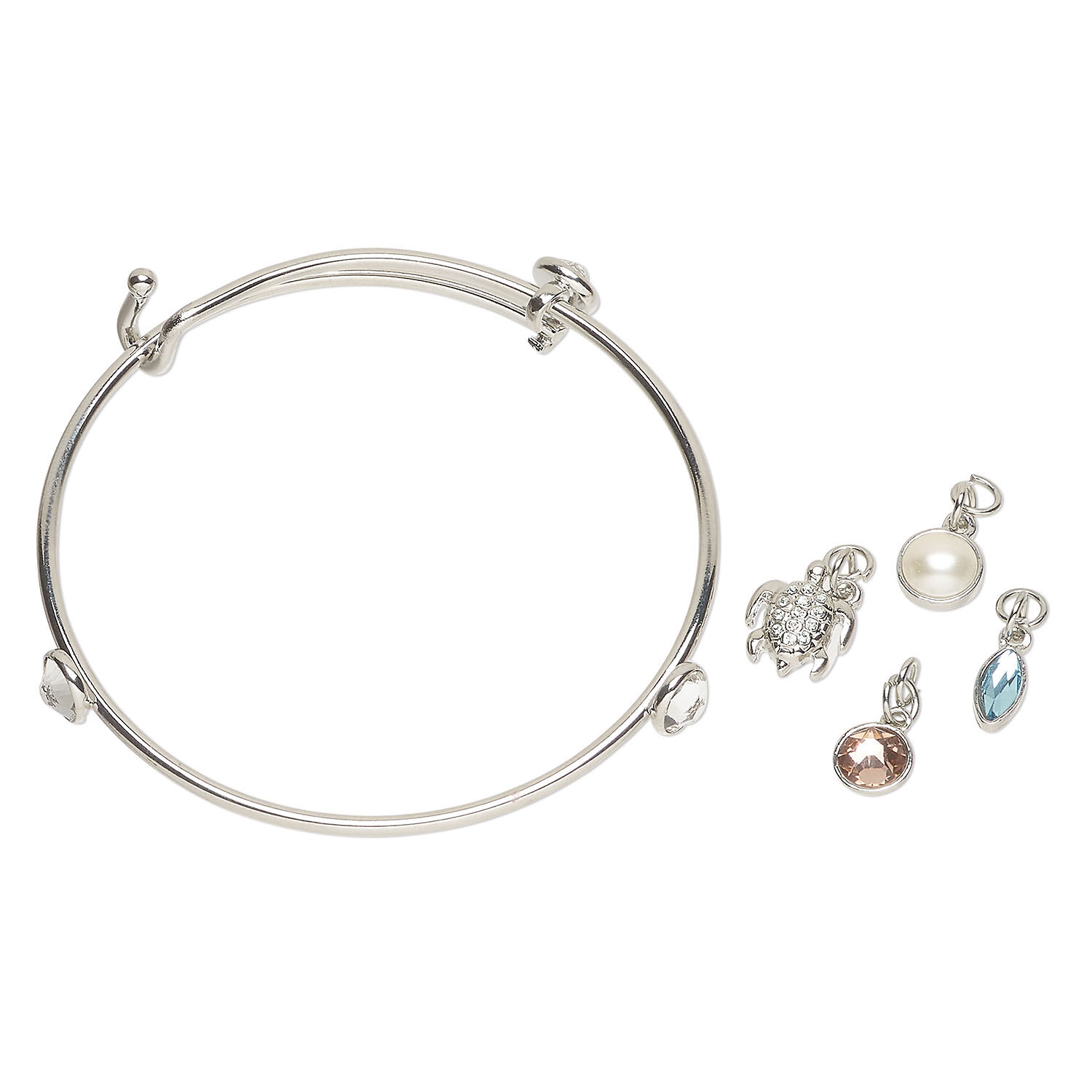 Bracelet / drop / charm assortment 1pkg5, antique silver-finished brass and steel / glass, vintage rose / clear / aquamarine, mixed sizes and shapes, 7-1/2 inches