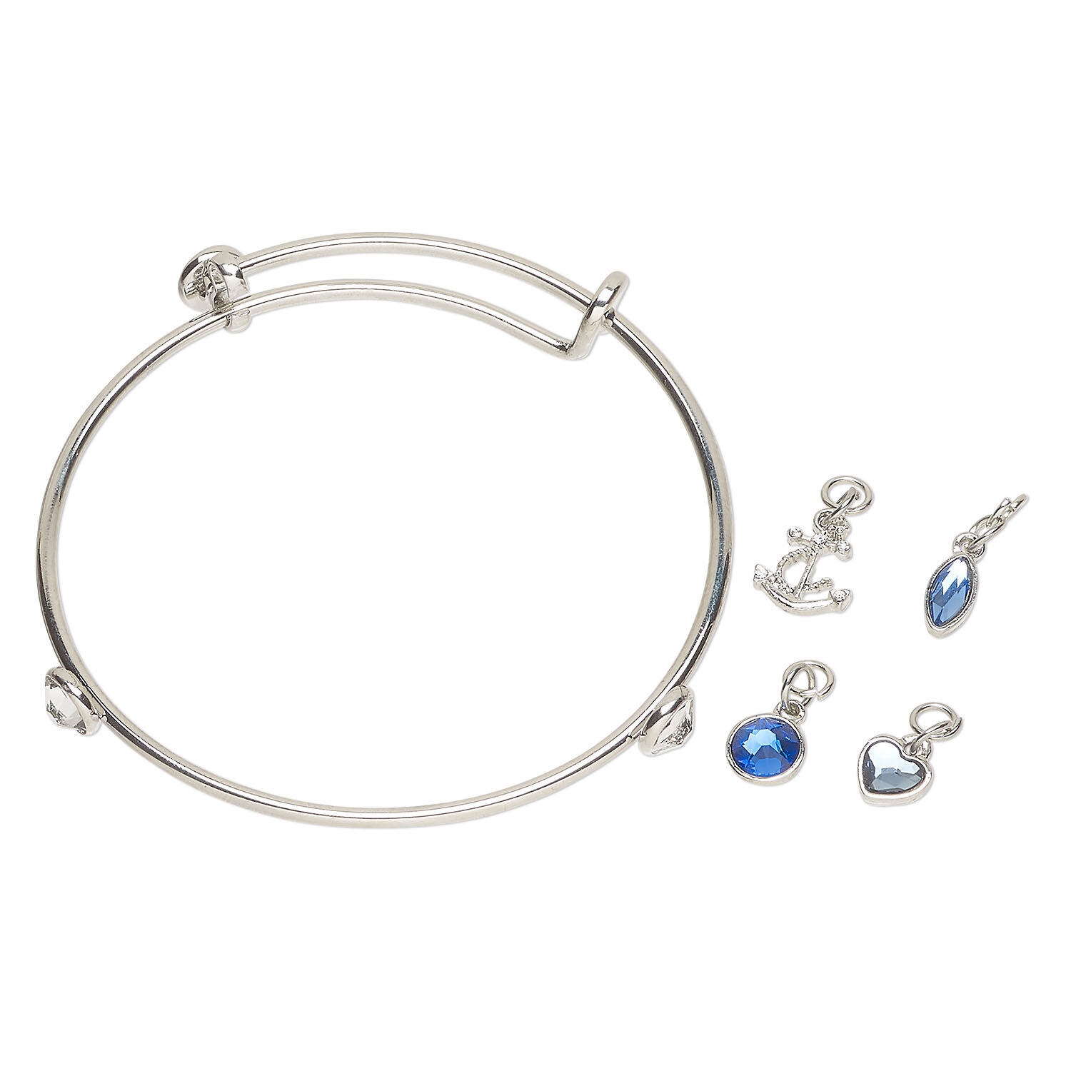 Bracelet / drop / charm assortment 1pkg5, glass / antique silver-finished brass and steel, mixed colors, mixed sizes and shapes, 7-1/2 inches