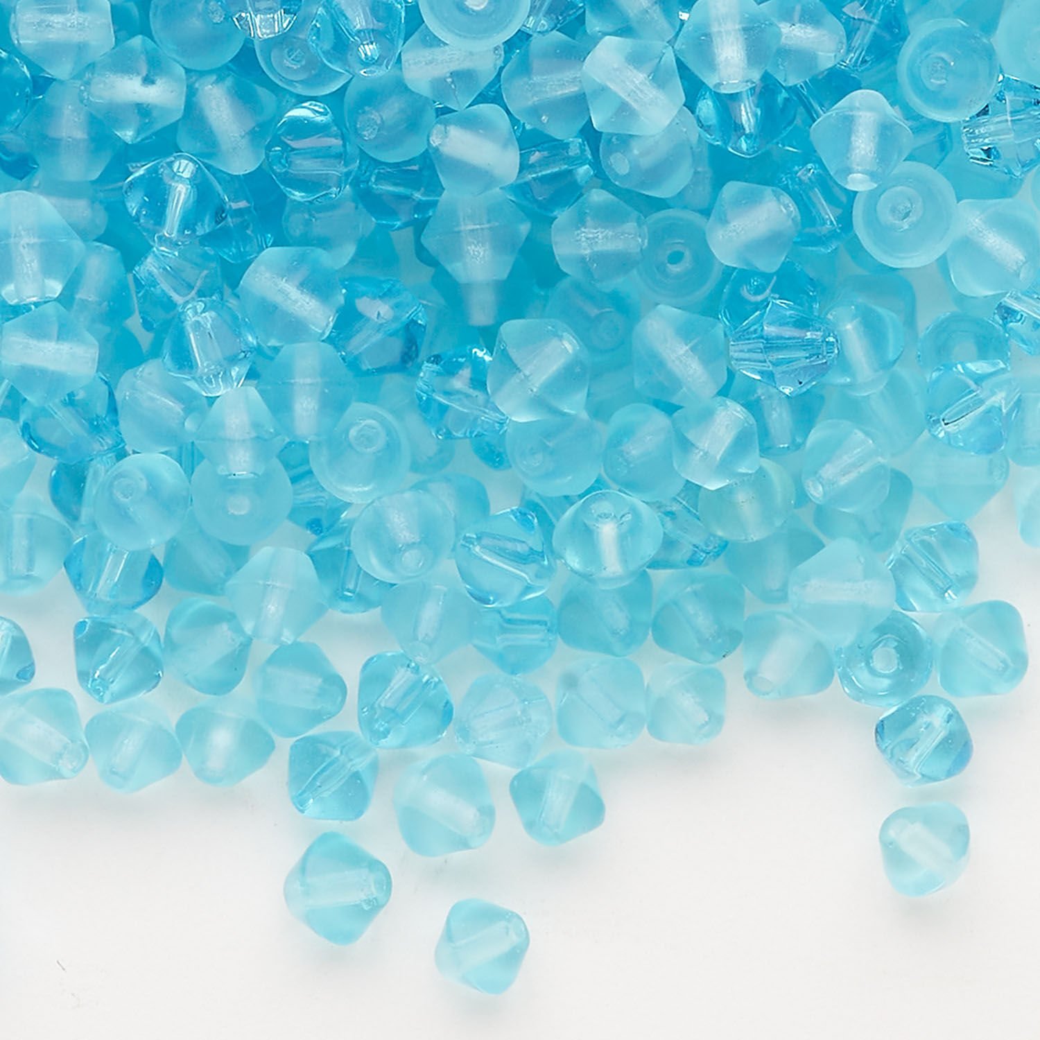 Bead, glass 1pkg1, translucent frosted aqua blue, 4mm bicone, 4 ounces.