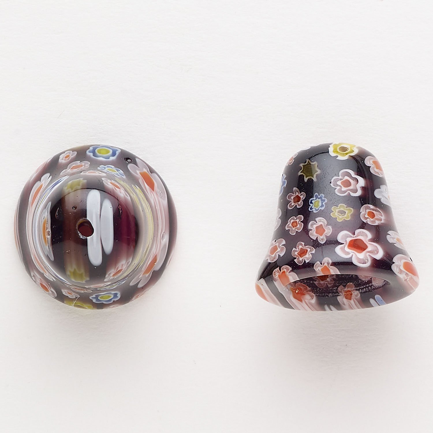 Cord end 1pkg2 millefiori glass, translucent dark purple / red / white, 17-18mm bell.