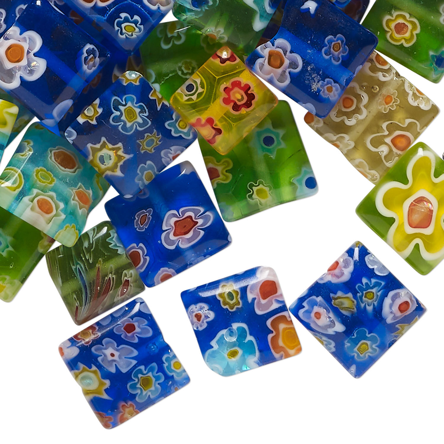 Bead mix, millefiori glass 1pkg2oz, opaque to transparent mixed colors, 8-11mm puffed square.