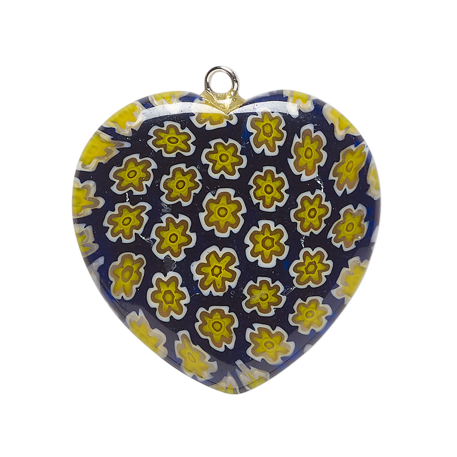 Focal, millefiori glass and silver-finished steel 1pkg1, translucent cobalt blue / yellow / white, 29-31mm puffed heart.