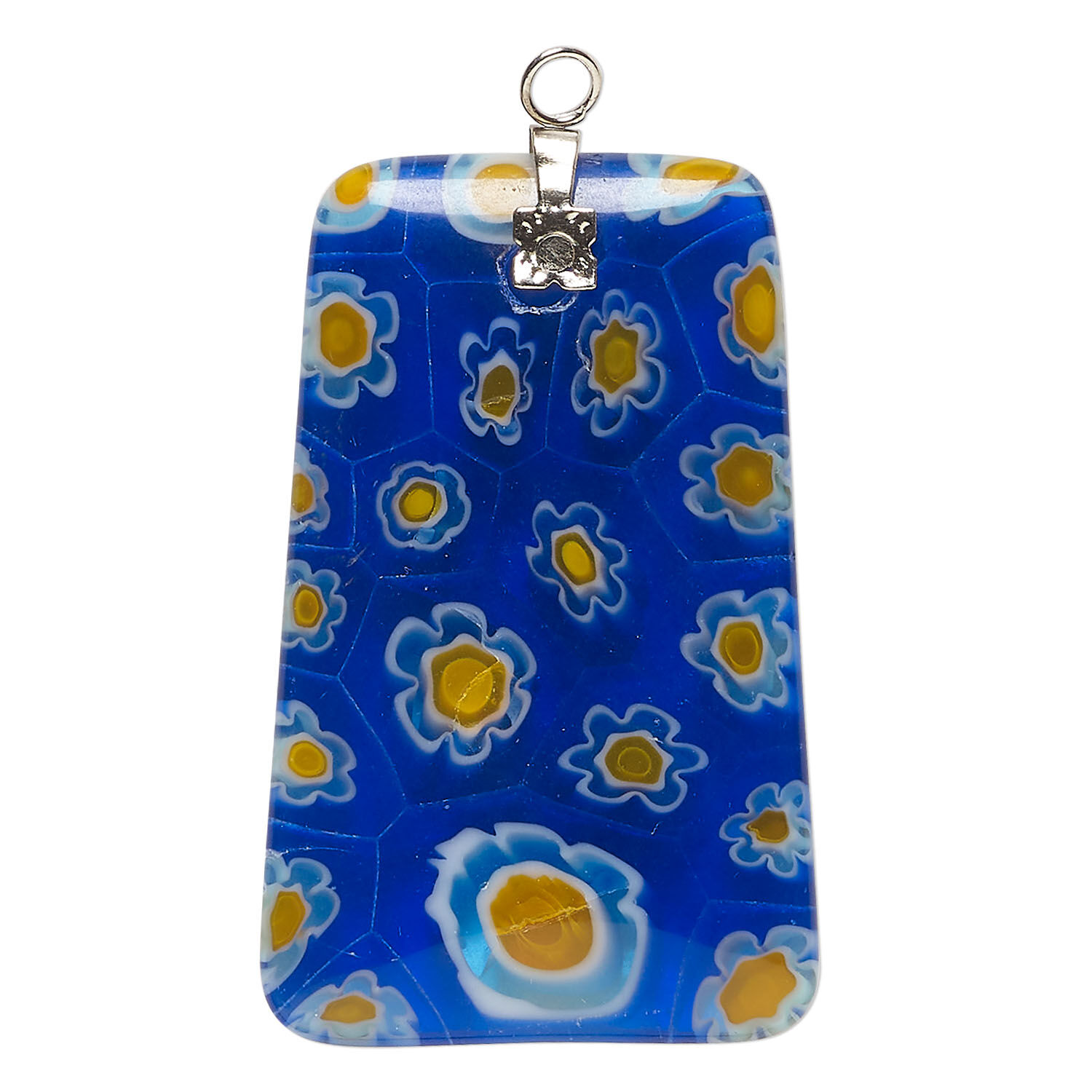 Focal, millefiori glass and silver-finished steel 1pkg1, translucent cobalt blue and multicolored, 42x26mm-43x27mm puffed trapezoid.