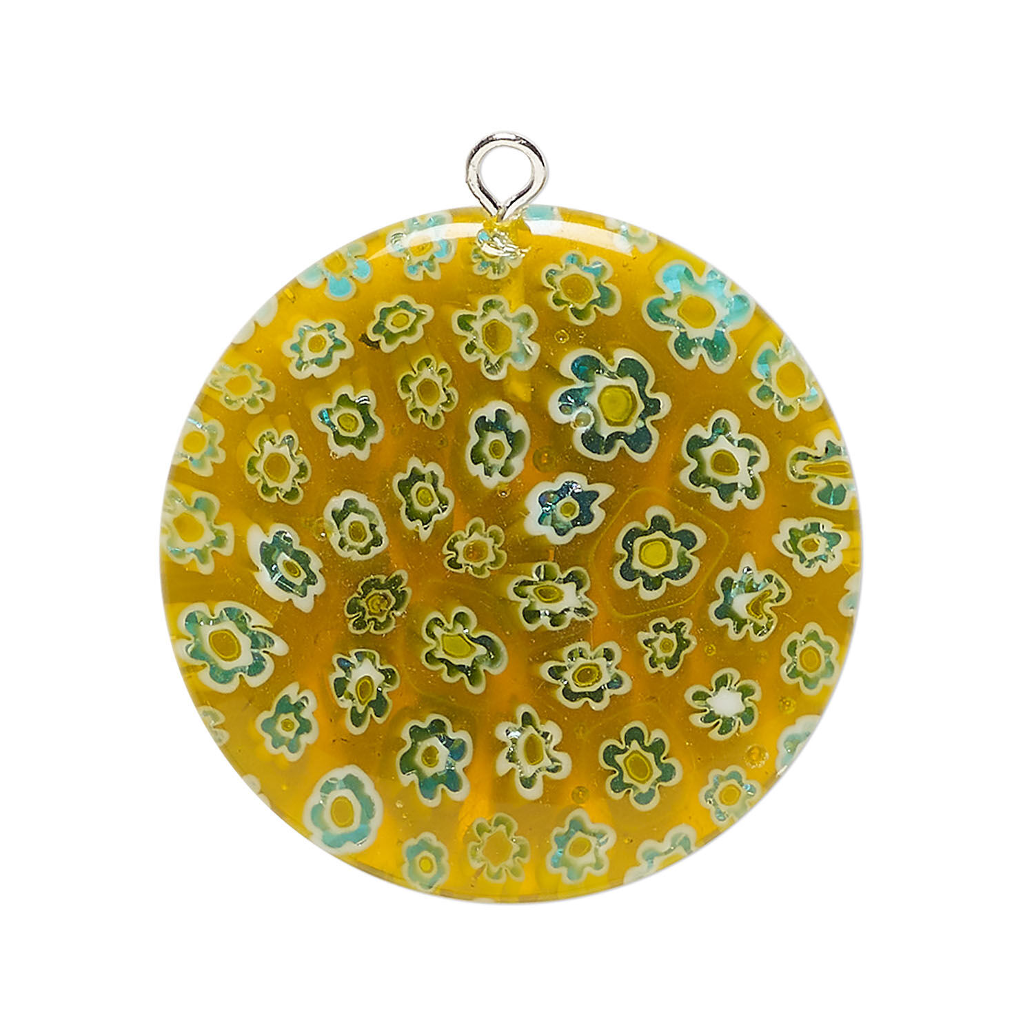 Focal, millefiori glass and silver-finished steel 1pkg1, translucent aqua blue and multicolored, 30mm puffed flat round.