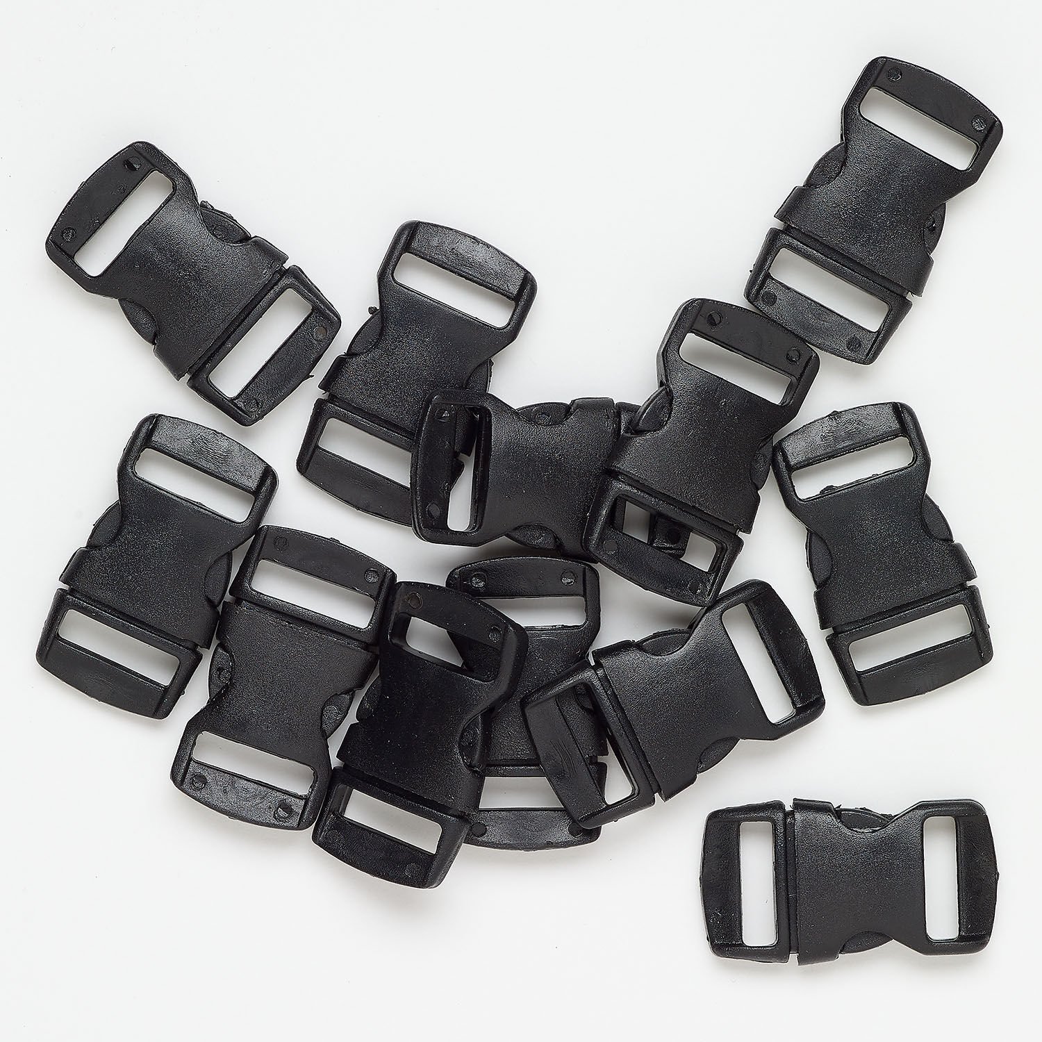 Two-piece side release buckle clasps have openings on both ends to accommodate various types of cords. Easily hook and unhook buckles by pressing both release tabs at the same time. This buckle clasp mix is ideal for use with nylon parachute cord to create survival-style bracelets, and many other creative design options.