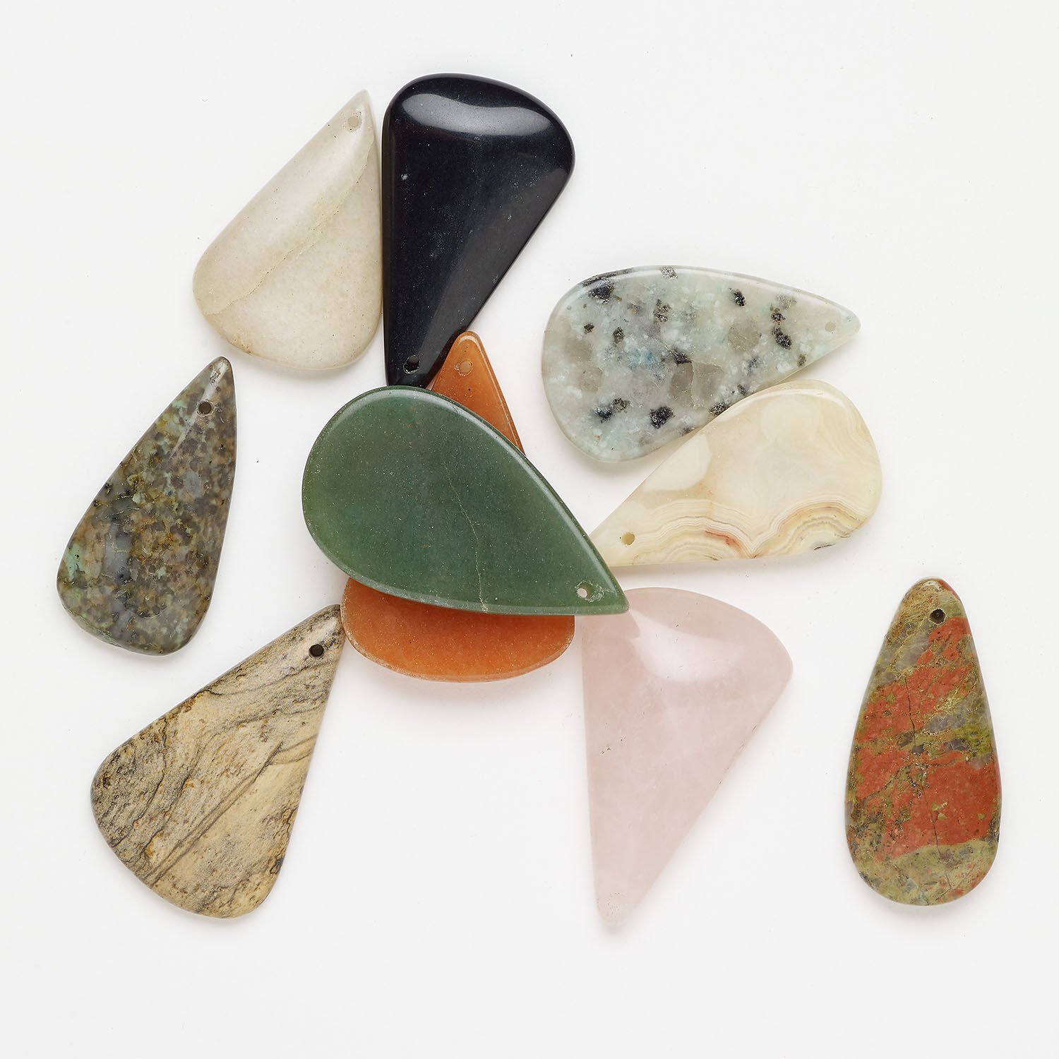 Multi-gemstone 1pkg10, top-drilled puffed / flat teardrop, focal mix 33x16mm-40x25mm